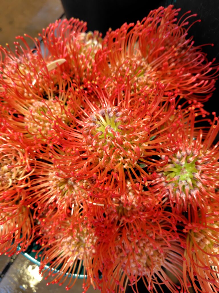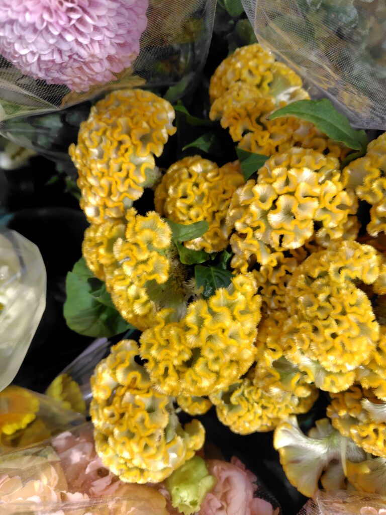 独特の“鶏冠(けいかん)”のようなフォルムと鮮やかな色味が目を引きます。花束に入れるとアクセントになりますし、単品使いでも存在感があります。